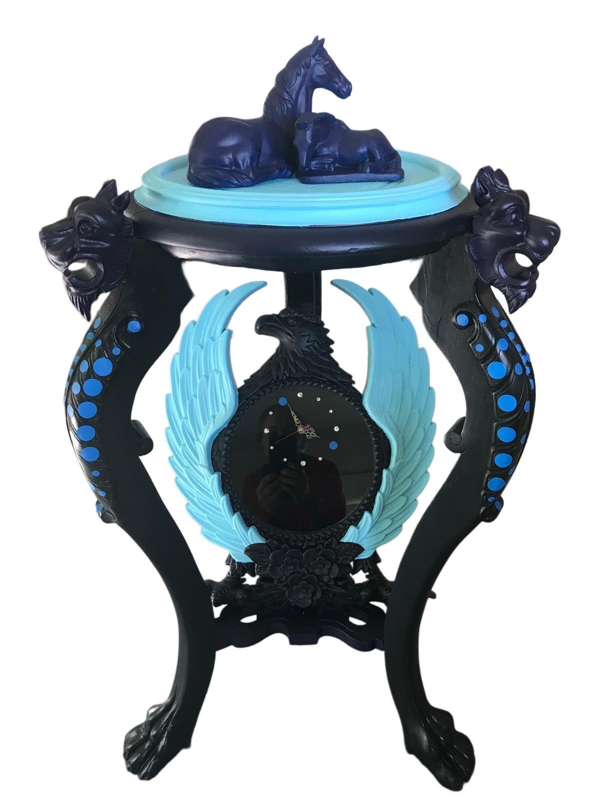 • Lederstiefel, Porzellanpferd, Eisenkrone, Holzwagen, Blattgold, Acryllack auf Holzplatte      45 x 80 x 30